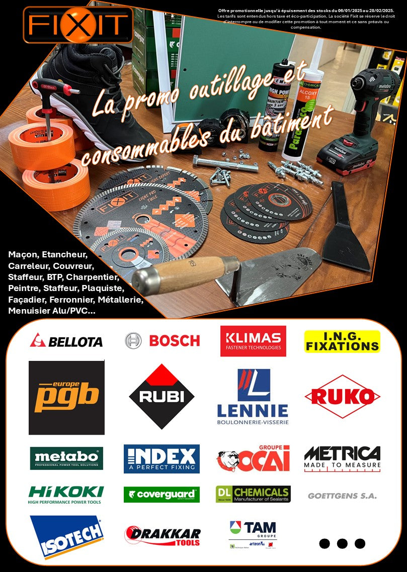 L’Outillage & Consommables pour les pros : catalogues d'EPI, fixation, électroportatif, protections (tête, auditive, oculaire, etc.), vêtements & signalisation dédiés aux professionnels du bâtiment. Qualité, conseils personnalisés et support de confiance pour entreprises & artisans.